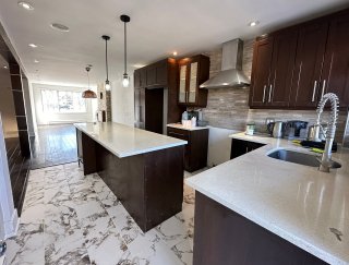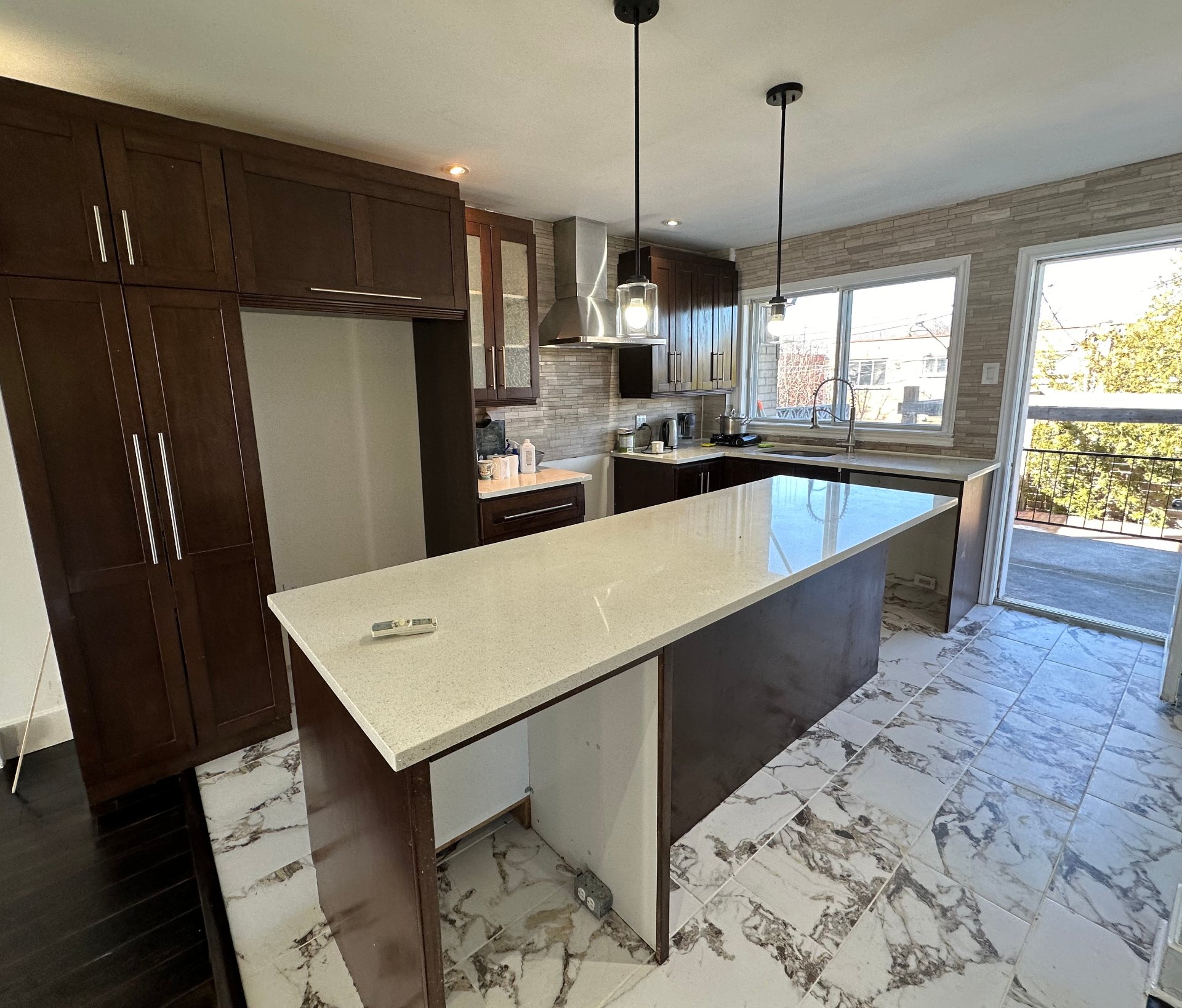 - Rénovation des armoires de cuisine et de l'îlot central.